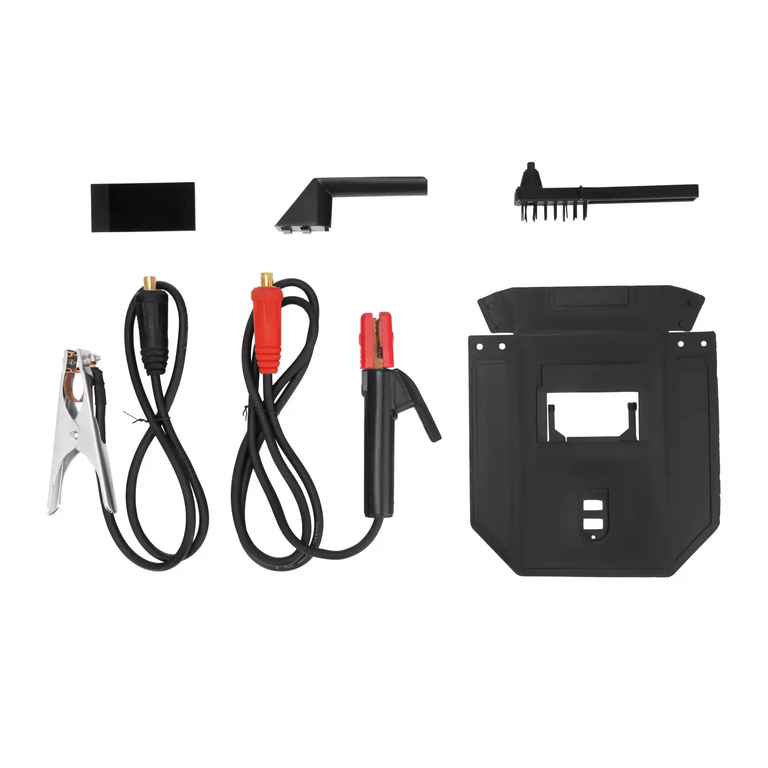 کابل گیره اتصال به زمین(طول: 1.2متر) ، کابل الکترود(طول: 1.8 متر) ، چکش برس‌دار ، کلاه ایمنی جوشکاری